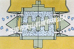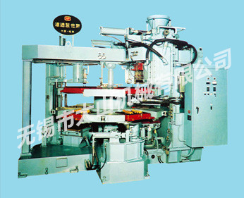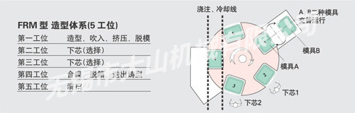 本机为旋转工作台式无箱水平分型的自动造型机,上、下模同时进入,通过挤压能够在 18 秒为一循环时间内高速度造型出均匀、高精度的铸型,是高性能、省力化的造型机。特别是下芯设计为 2 个工位,所以即使是泥芯较多的铸型也无需延长循环时间而能高效率发挥作用。此外,因框无反转动作,简便的构造设计使操作较为方便。因采用砂的充填从上、下框两侧同时进入的新方式,这种新型设计的造型机使铸型硬度和充填效果都得到确实的保证。